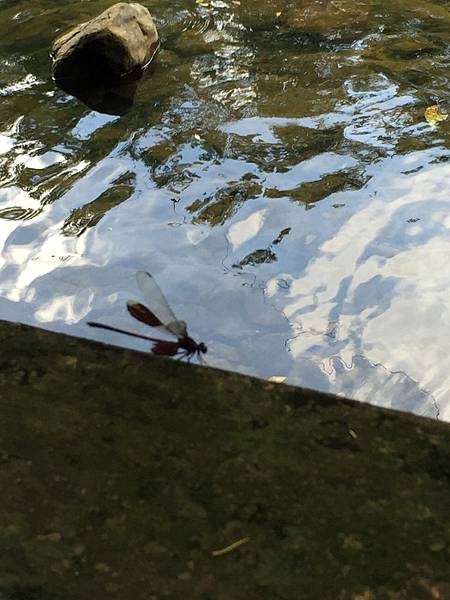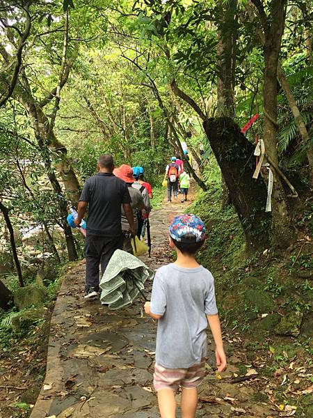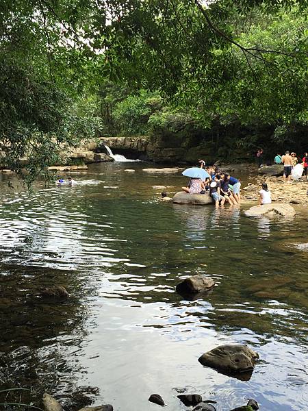 用完餐,下了一陣大雷雨,我們撐著傘行動,虎豹溪這段路不太平穩,我又帶著AWEN,必需得非常小心。所以有一段路我是沒有拿出手機拍照的。看到溪水時,路漸漸平穩,溪水非常非常潮清澈,足以見底。當我們看到有人在溪水裡玩水、游泳時,AWEN問了導覽人員,這裡是可以游泳的嗎?答案是,不行。這裡是水土保護區不行游泳,以前只要有人下水就會有警察來取締,近年來警察也不取締了,就好像默許了這件事情。但我想,秉持著愛護生態環境的心,我們就不要做這樣的事。